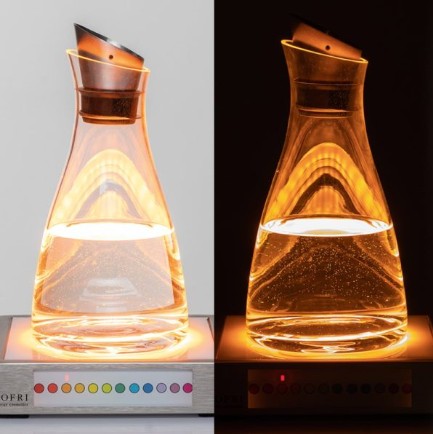 Eine Karaffe mit Wasser wird mit den von Ihnen benötigten Wellenlängen der Farben belebt. Trinken Sie dieses Wasser und schmecken Sie den Unterschied!